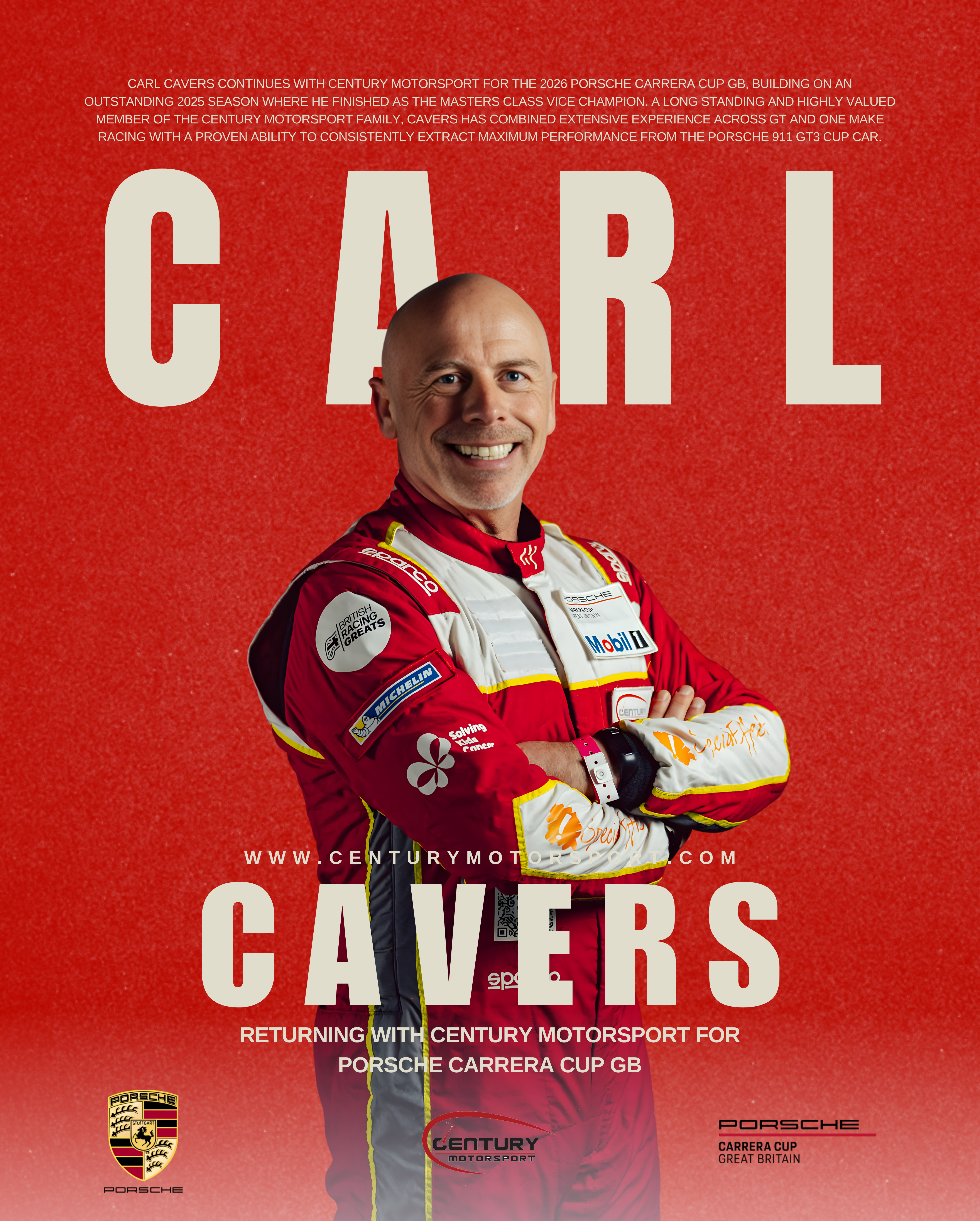 Carl Cavers continues with Century Motorsport for the 2026 Porsche Carrera Cup GB, building on an outstanding 2025 season where he finished as the Masters class Vice Champion. A long standing and highly valued member of the Century Motorsport family, Cavers has combined extensive experience across GT and one make racing with a proven ability to consistently extract maximum performance from the Porsche 911 GT3 Cup car.
